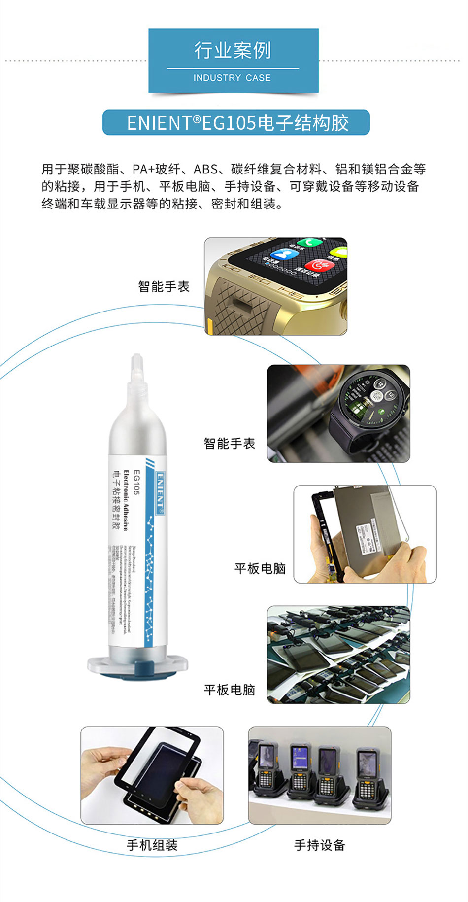 ENIENT EG105是一種高強度的快干型的具有一定柔韌性的一款高強度電子外殼強力膠。能夠有效解決電子外殼翹邊問題,用于運動相機外殼封裝,電子貓眼外殼組裝,精密電子儀器塑料部件粘接等。